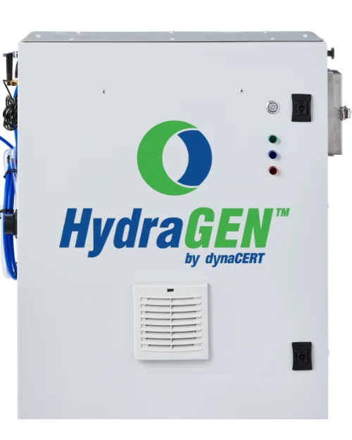 The dynaCERT HydraGEN technology is a unique, patented system that produces hydrogen and oxygen on demand through electrolysis. This process uses distilled water and potassium hydroxide (KOH) to generate clean gas, which is then introduced into the diesel engine’s air intake. The hydrogen and oxygen act as a combustion enhancer, leading to a more efficient and complete fuel burn